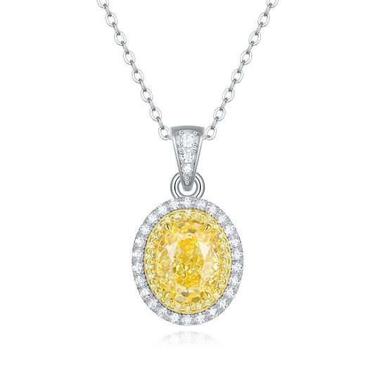 Crafted with ingenuity to amplify the beauty of the fancy diamond, this necklace features a simple yet refined design to highlight the unique radiance of the 2CT yellow oval moissanite. Retro elements easily catch the eye, emitting a warm and brilliant glow with a sweet hue. An essential piece for...