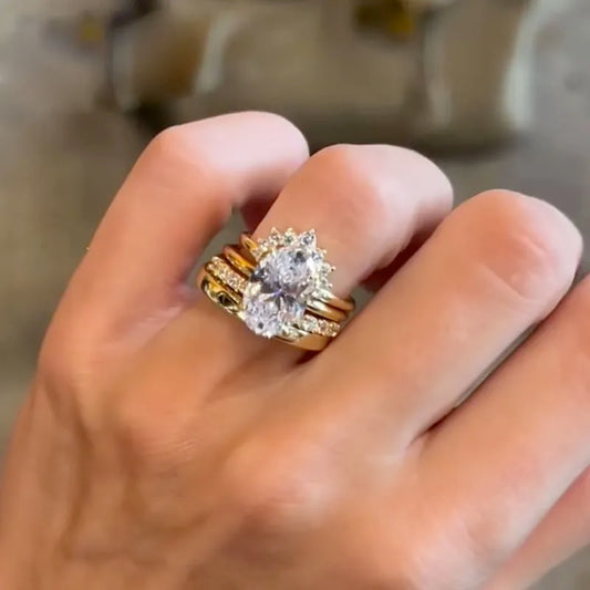 Crafted in Sterling Silver 925, this 3-piece wedding set redefines stacked romance. At its core is a 4.0-carat oval-cut simulated diamond (9×11mm), paired with two diamond-encrusted bands — one featuring a curved, tiara-like design and the other a delicate open-ended style. Together, they create a cohesive, eye-catching stack perfect for...