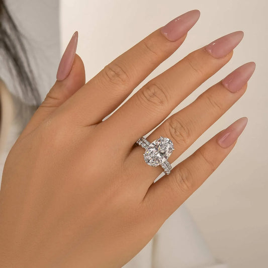 Luxurious Design & Timeless CraftsmanshipThis 2-piece wedding set features a 5.0-carat oval cut center stone, precision-shaped to an 8x12mm elegant silhouette in polished 925 sterling silver. The oval cut’s smooth curves and elongated facets maximize light reflection, creating a breathtaking display of brilliance. The matching band is detailed with intricate...