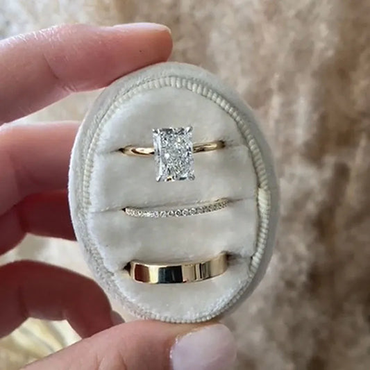 Features a 3.0-carat radiant-cut simulated diamond (8×8mm) — its stepped facets blend vintage elegance with modern sparkle. The matching band includes subtle accent stones for cohesive brilliance.Hypoallergenic and nickel-free, made for lasting beauty and everyday comfort.