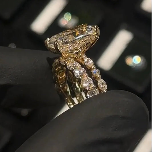 Crafted as a radiant 3-piece wedding set, this design centers on a striking 9×11mm oval cut stone with an elegant 3.5Ct presence that immediately draws the eye. The main ring features a luminous simulated diamond, framed by two coordinating bands that add layered sparkle and visual depth—creating a bold, dimensional...