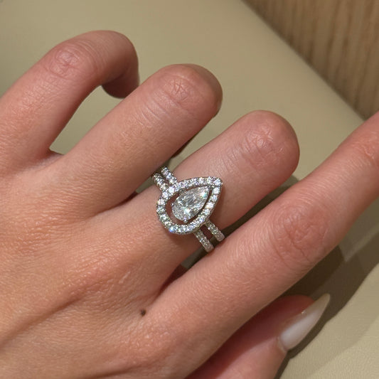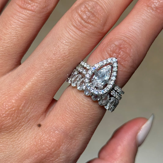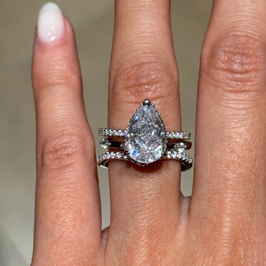 This 3-piece set features a 1.5-carat pear-cut simulated diamond (5×9mm teardrop shape) set in polished 925 sterling silver. All bands are adorned with pavé stones, their sparkle enhancing the center stone’s radiance.