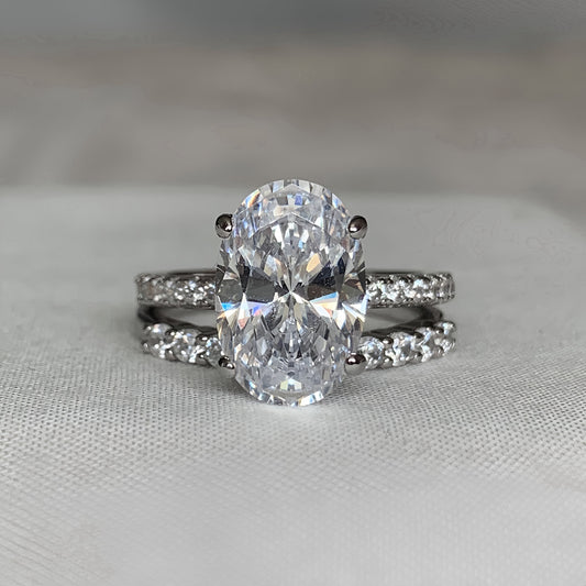 Luxurious Design & Timeless CraftsmanshipThis wedding set features a 5.0-carat oval cut center stone, precision-shaped to an 8x12mm silhouette in polished 925 sterling silver. The oval cut’s elongated facets maximize light reflection, creating a breathtaking display of brilliance. The matching band is detailed with intricate milgrain edges and subtle accent...