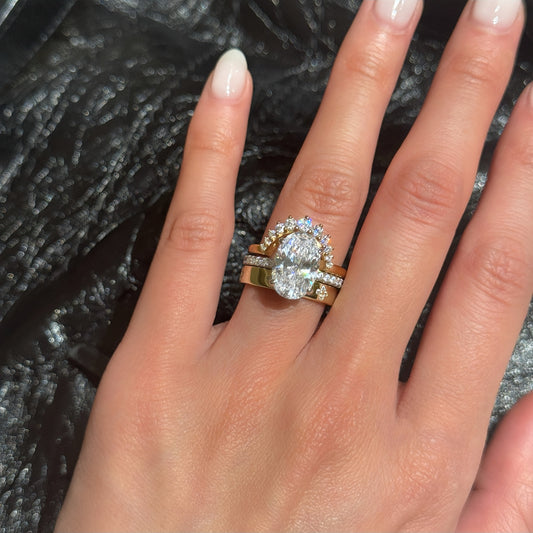 Design Inspiration: Grace in Every AnglePolished, expressive, and designed to endureIt is designed to celebrate commitment with an elevated, wearable silhouette. This wedding set is designed to feel cohesive and elevated. The centerpiece is a radiant 5.5 carat Oval cut stone, sized 9*13, designed to anchor the full set with...