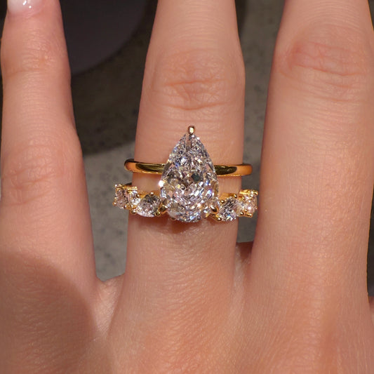Designed as an elegant 2-piece wedding set, this ring set highlights a graceful 7×11mm pear cut center stone with a refined 3Ct presence. The softly tapered silhouette of the simulated diamond brings a gentle, romantic flow to the design, while the coordinating band adds layered sparkle and enhances the overall...