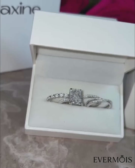 Luxurious Design & Masterful Craftsmanship This 3-piece wedding set features a 3.5-carat radiant-cut center stone, crafted into a refined 7×10mm elongated silhouette and set in polished 925 sterling silver. The radiant cut’s crisp facets and softened corners create exceptional sparkle, while the matching engagement band and wedding band, detailed with...
