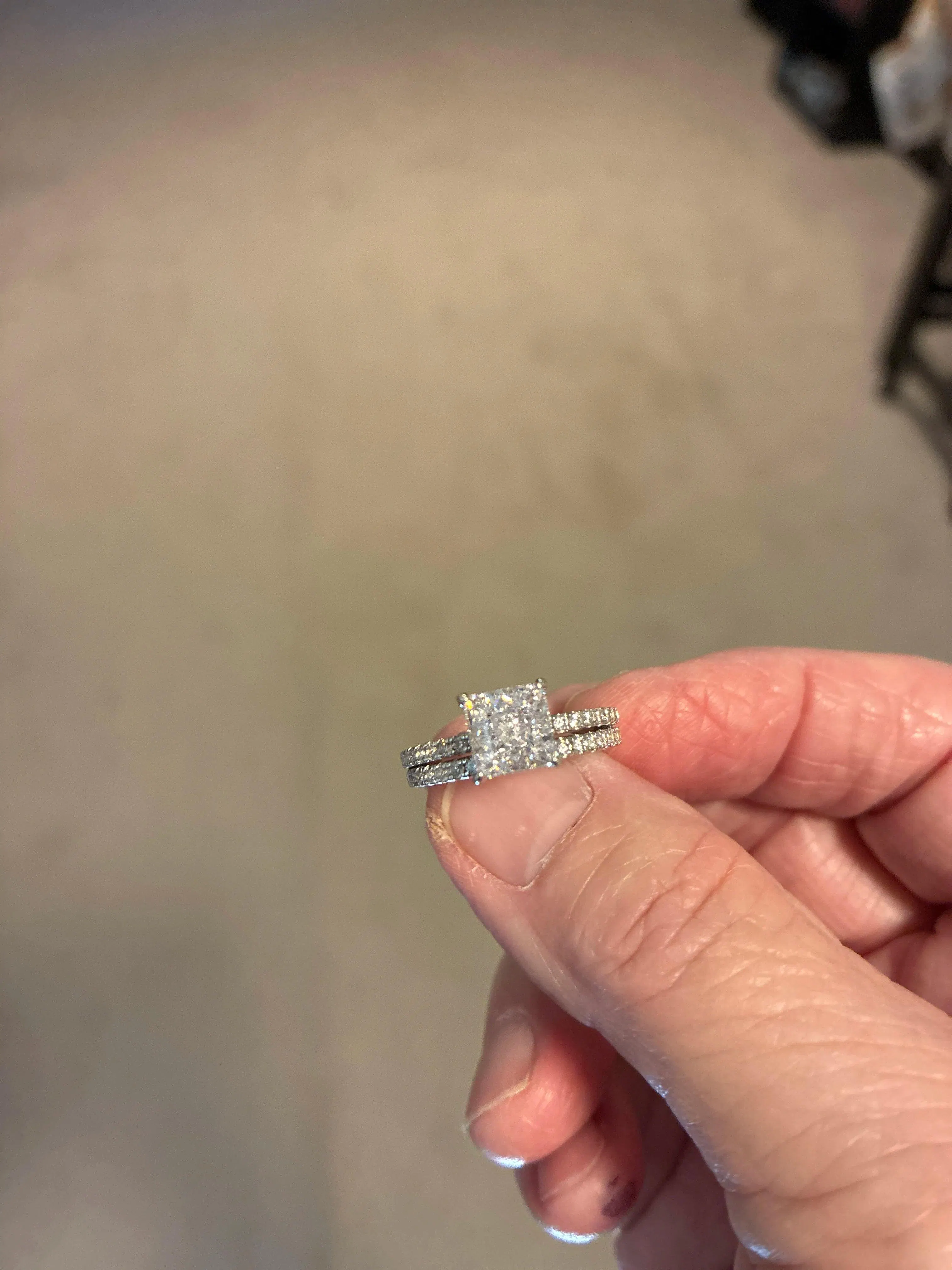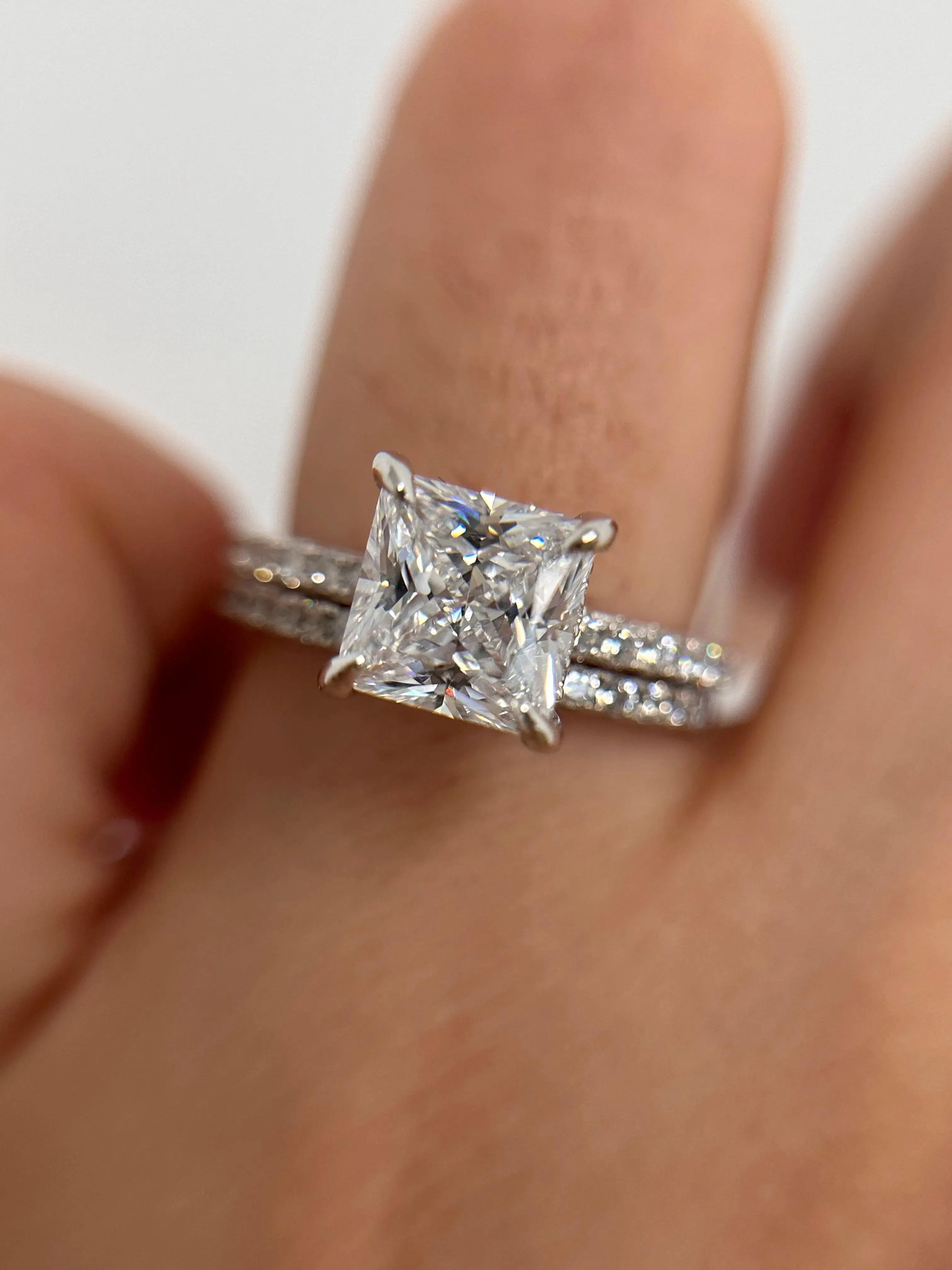 It is designed to celebrate commitment with an elevated, wearable silhouette. This wedding set is designed to feel cohesive and elevated. Leading the look is a radiant 2.0 carat Princess cut stone, sized 7*7, designed to anchor the full set with confident brilliance. Finished with a matching band, it builds a layered profile that's elegant, not overwhelming.