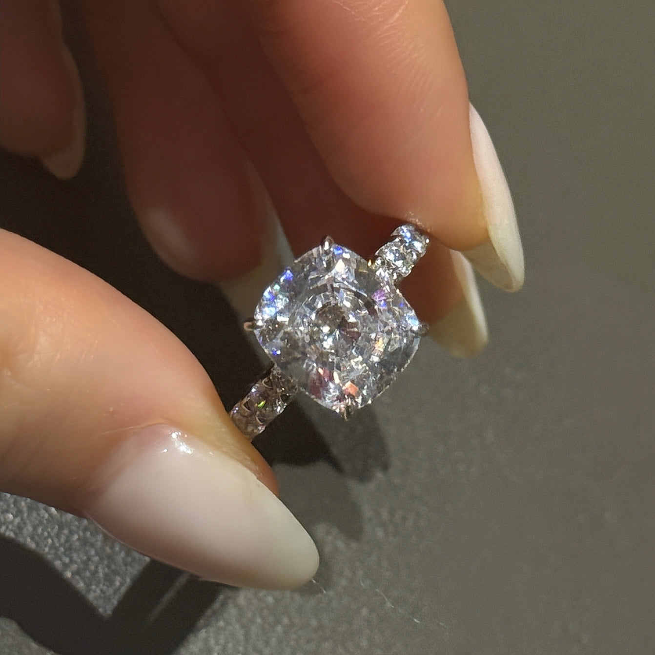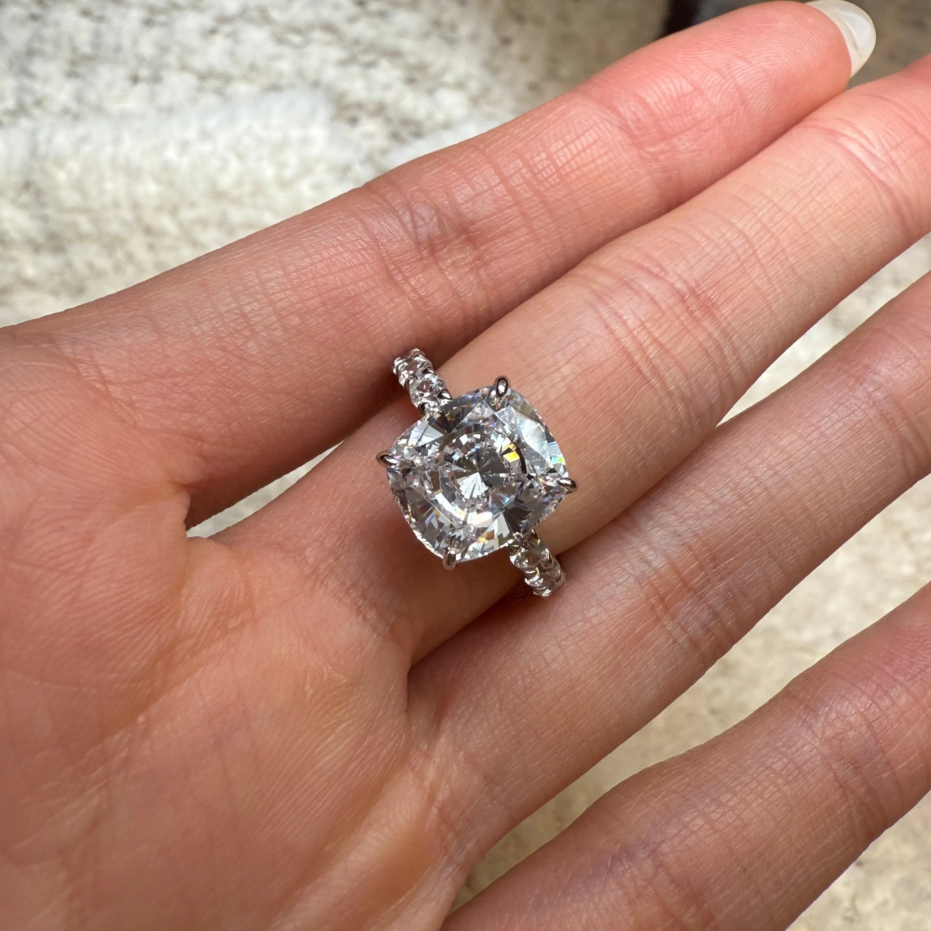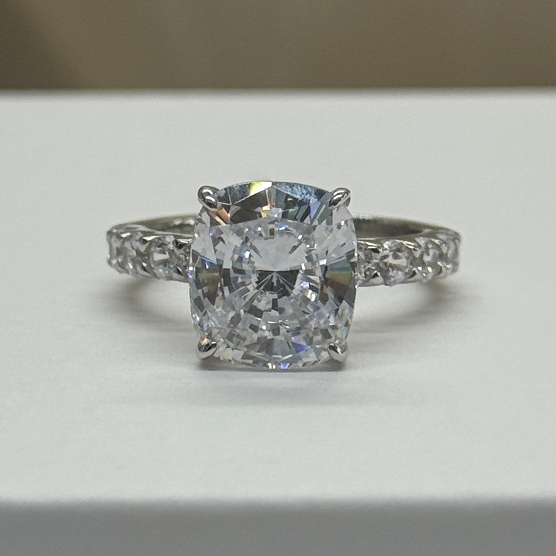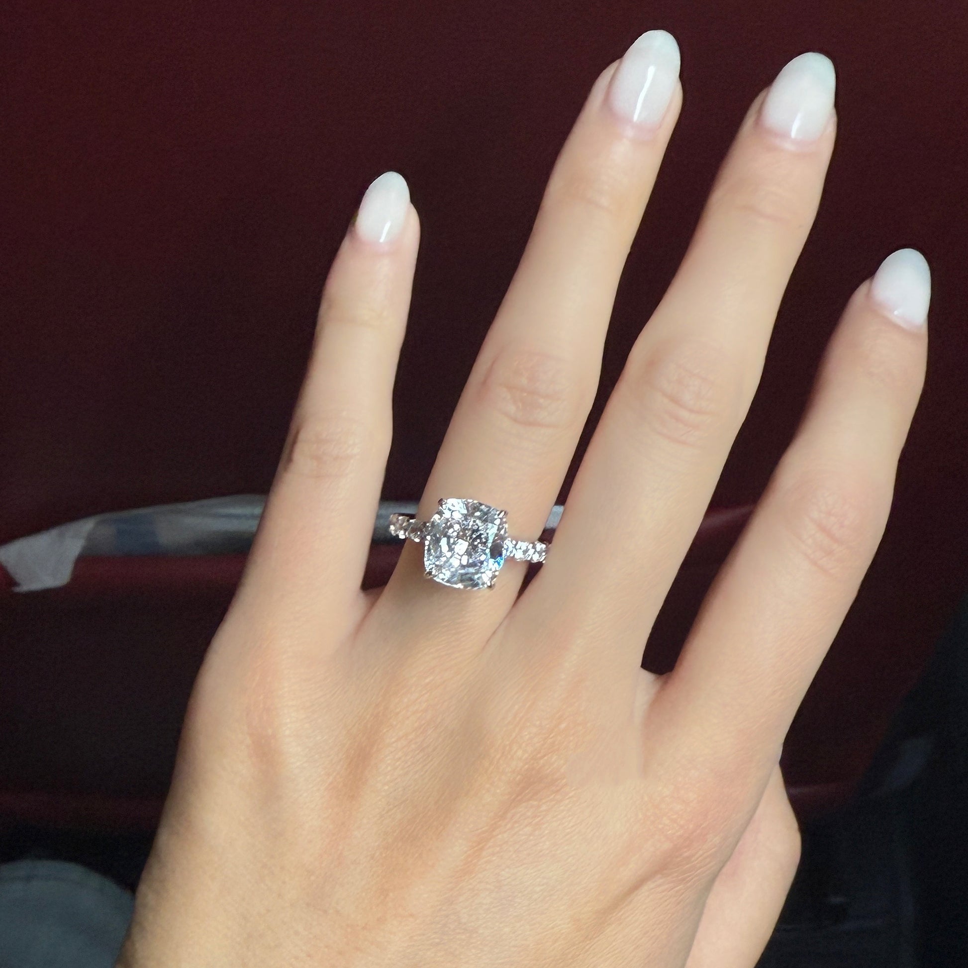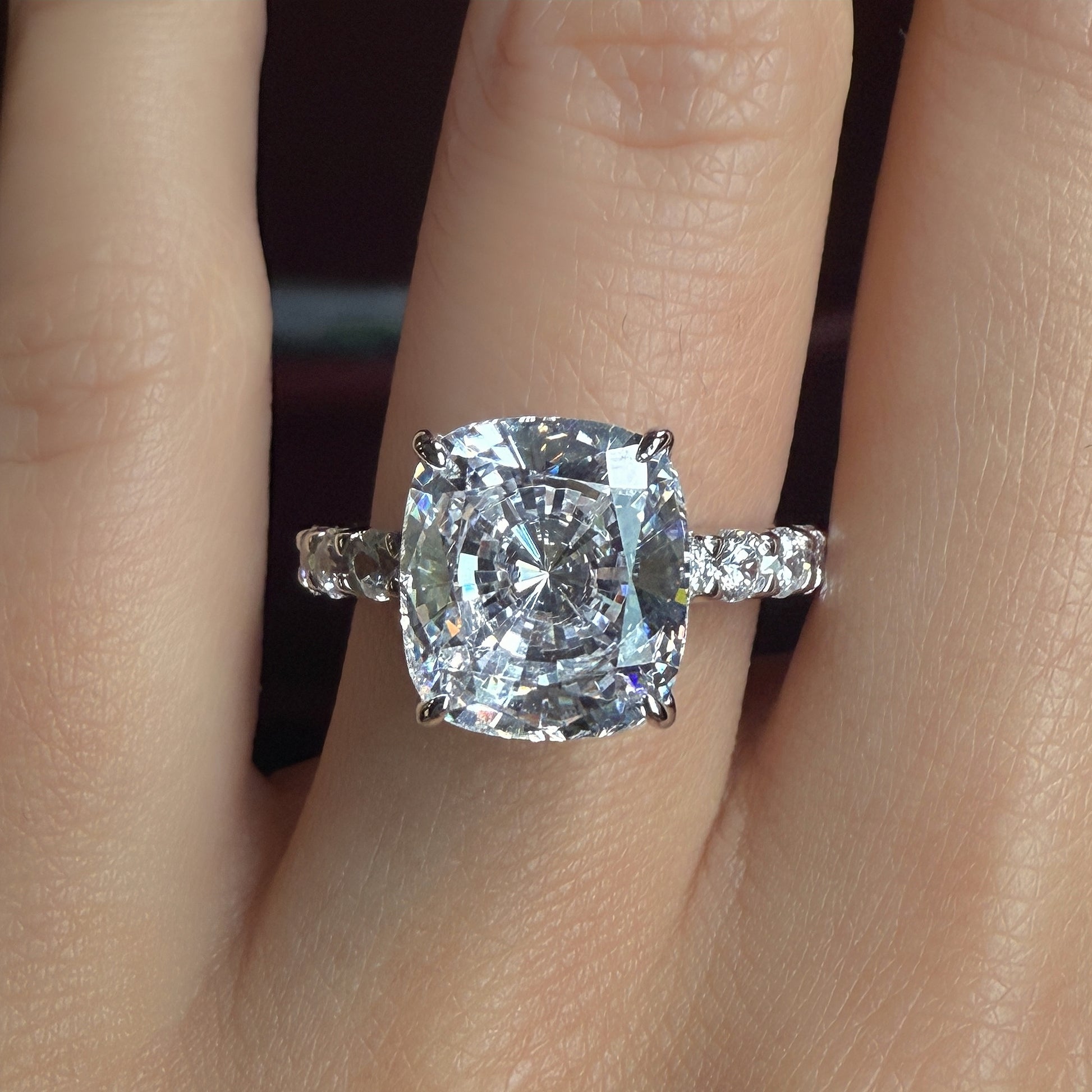 Balanced shape with gentle brilliance, this engagement ring centers on a refined 9×10mm cushion cut stone with an elegant 3.5Ct presence.