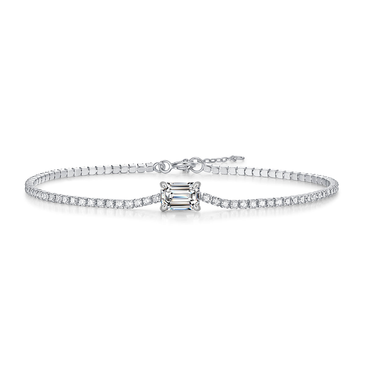 Crafted from Sterling Silver 925, this bracelet features a 1CT moissanite. Its smooth lines, paired with the precisely cut long-shaped square moissanite, showcase brilliant radiance, exuding a three-dimensional, exquisitely shiny charm. It mirrors your mood, emanating an elegant, light-luxury aura—a petite lucky token. With a simple and elegant design, it’s versatile for any occasion and easily stacks with other jewelry, embracing the layering trend.
